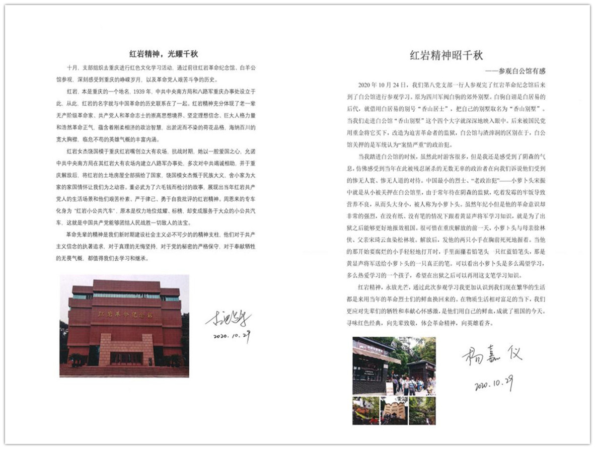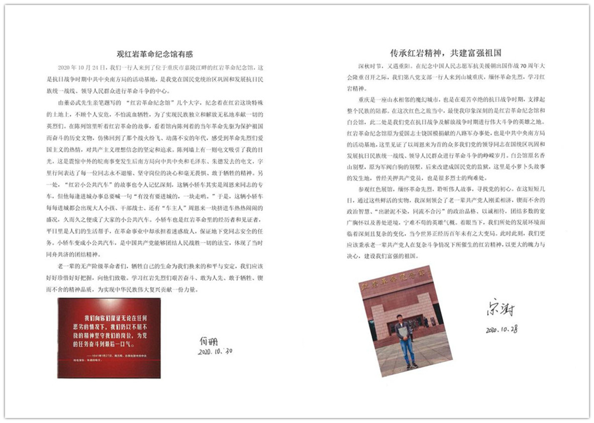 在这次的参观学习过程中,我们共同缅怀革命先烈,共同回顾他们当年艰苦抗战的故事,共同见识祖国逐渐强盛的发展历程。未来,我们需要不断传承红岩精神,坚守初心使命,为祖国建设奉献出自己的力量。在本次行程结束后,几位党员就此次的参观学习经历撰写了个人心得体会,在此分享: