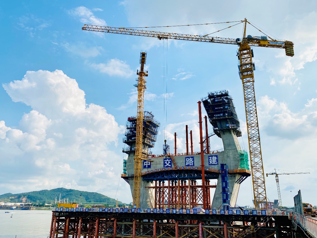 佛山市富龙西江特大桥工程建设总里程为5.81公里,总投资38.9亿元,设计速度80公里/小时,采用一级公路标准兼顾城市道路功能,双向8车道。该项目主桥采用主跨为580m的UHPC钢混组合梁斜拉桥,目前正处于主塔中塔柱爬模施工当中,计划2022年底建成通车。
