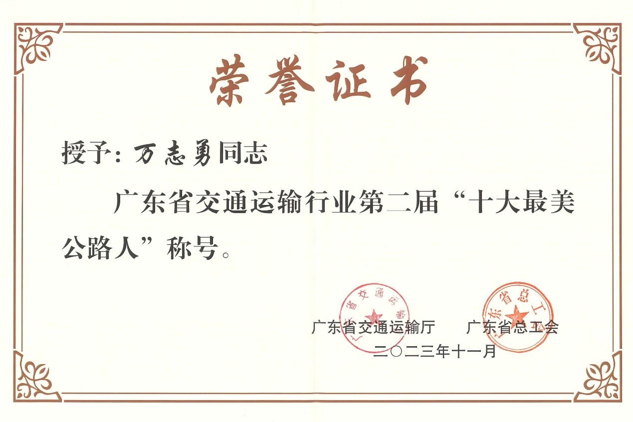 为大力弘扬新时代交通精神,展示中国式现代化开路先锋的良好风采,发掘宣传公路交通行业最美典型,加快建设交通强国先行示范省,近期广东省交通运输厅、省总工会联合组织开展了第二届“最美公路人”推选宣传活动,公司副总工程师万志勇喜获广东省交通运输厅授予“广东交通运输系统第二届‘十大最美公路人”荣誉称号。