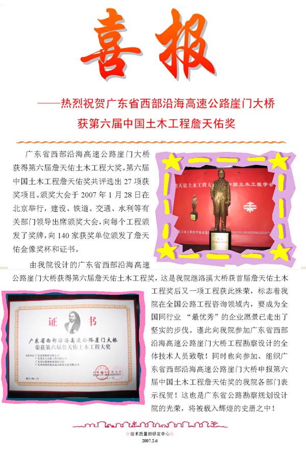 我院设计的崖门大桥获第六届詹天佑奖