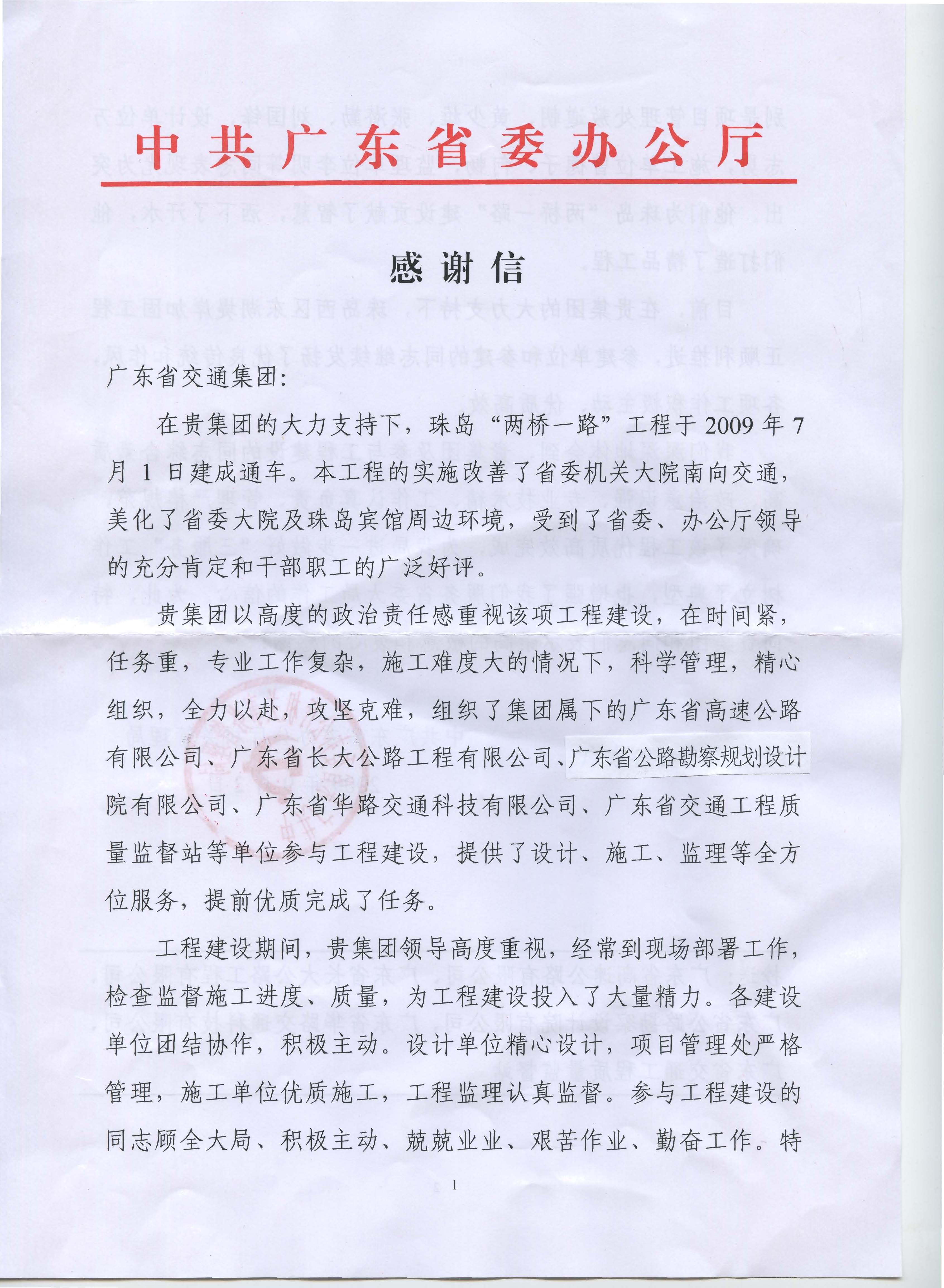 省委办公厅机关管理局关于珠岛“两桥一路”工程的感谢信