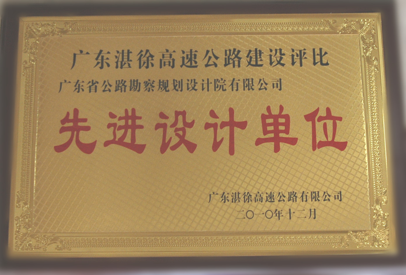近日,我司被广东湛徐高速公路有限公司授予项目建设“先进单位”荣誉称号,同时设计代表王舒同志被评为“先进工作者”。湛徐项目由公司第三路桥设计部负责设计,其优质的设计后服务水平在得到业主单位充分肯定的同时,也为公司树立了良好的外部形象,特此祝贺。