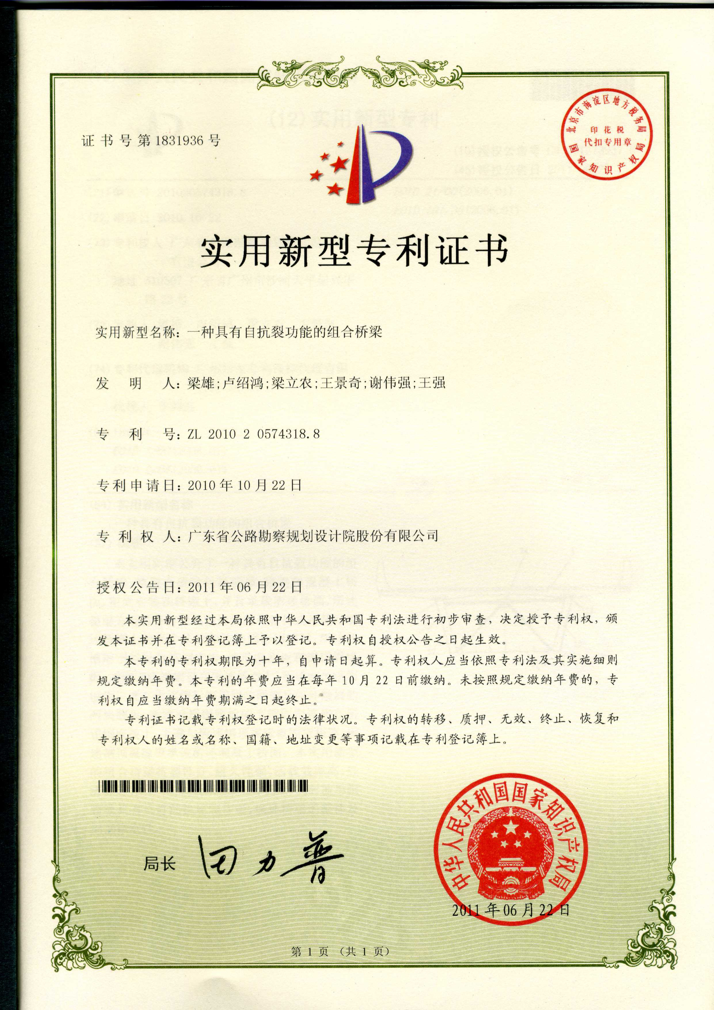 公司研发的“一种具有自抗裂功能的组合桥梁”技术成果,于2011年6月22日被中华人民共和国国家知识产权局授予实用新型专利权。