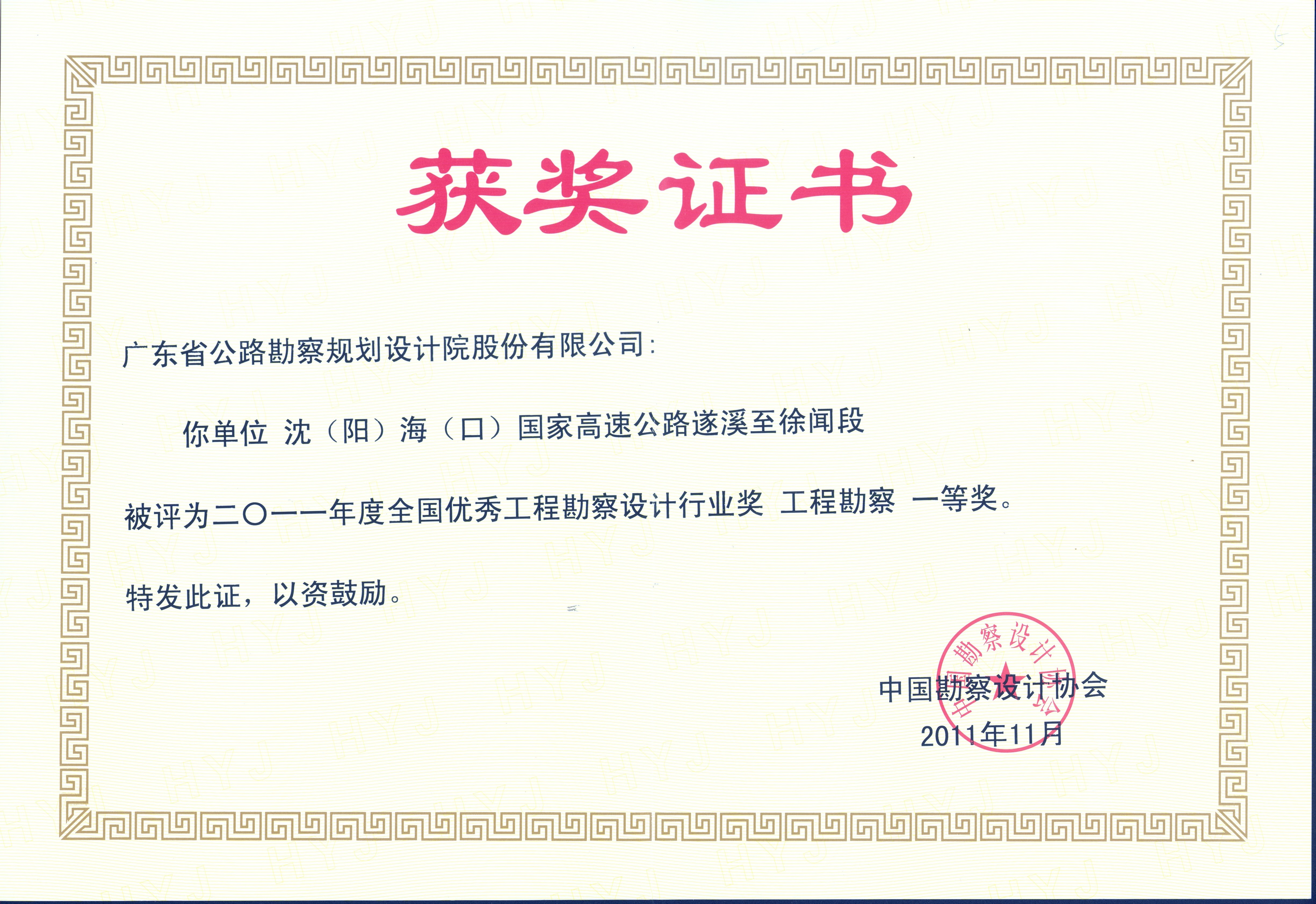 公司完成的四个项目分别荣获“2011年度全国优秀工程勘察设计行业奖 工程勘察一、二、三等奖”