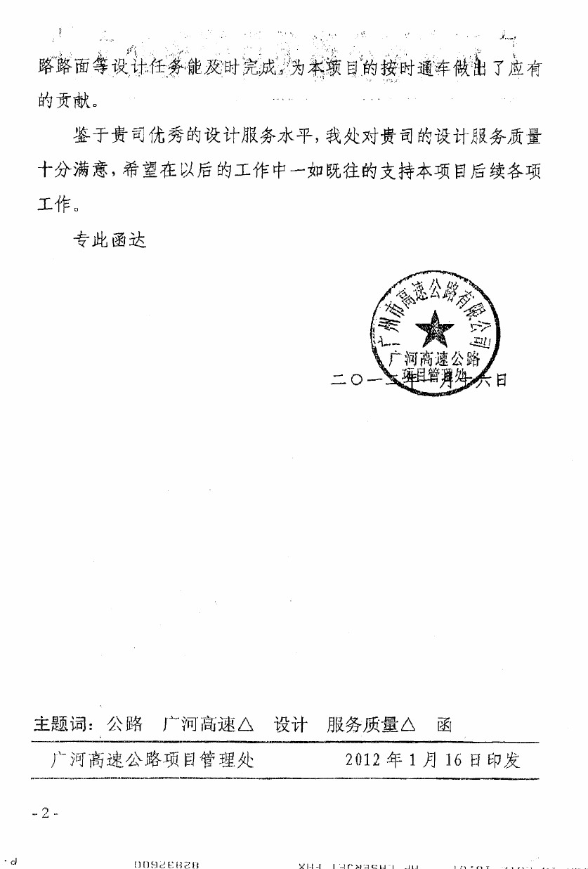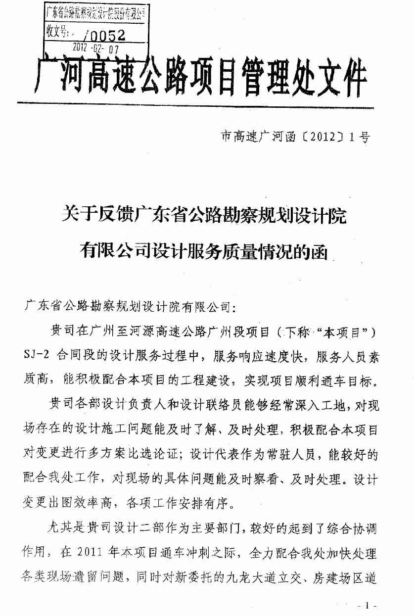 近日,业主单位广河高速公路项目管理处专函盛赞公司设计后服务工作,并对以第二路桥设计部为主的服务团队在广州至河源高速公路广州段设计后服务中的优异表现给予了充分肯定和高度赞扬,认为我司设计服务水平“优秀”,对我司的服务质量表示“十分满意”。