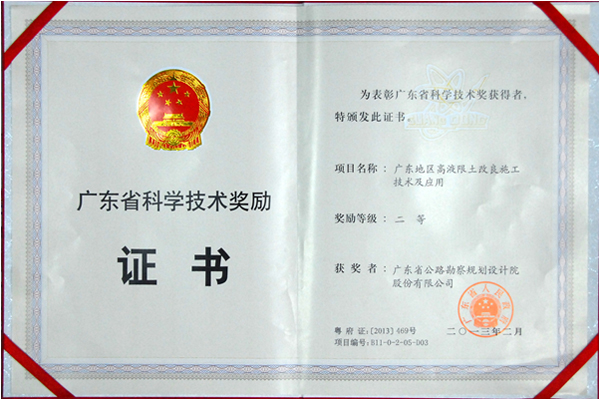 公司参与完成的“广东地区高液限土改良施工技术及应用”项目获广东省科学技术二等奖