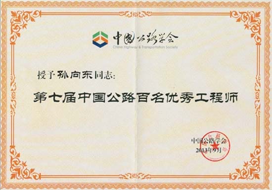 孙向东副总工程师荣获第七届中国公路百名优秀工程师