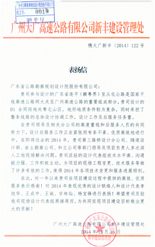 近日,广州大广高速公路有限公司新丰建设管理处发来表扬信,对我司在大广高速连平至从化段项目中提供的高效、优质服务表示赞扬,同时对负责该项目的第三路桥设计分公司等组织和个人给予了通报表扬。特此报喜。