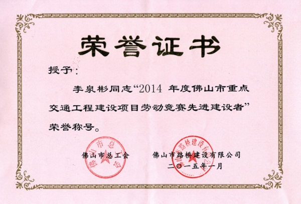 近日,我司第三路桥分公司驻广明高速公路陈村至西樵段设计代表李泉彬同志受到佛山市总工会和佛山市路桥建设有限公司联合表彰,荣获2014年度“佛山市重点交通工程建设项目劳动竞赛先进建设者”称号,李泉彬同志曾获“先进工作者”、“先进建设者”称号,为公司树立了良好的外部形象,赢得了声誉,特表祝贺!