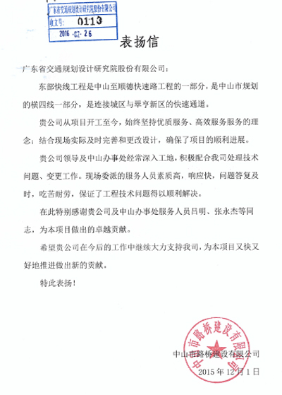 近日,中山市路桥建设有限公司发来表扬信,对我司在东部快线工程中的提供的高效、优质的设计后服务表示赞扬,同时该项目所属的第一路桥设计分公司及设计代表吕明、张永杰等个人给予了通报表扬。特此报喜。