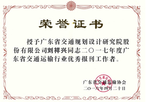 我公司报刊《广东交通规划设计》被广东省交通运输协会评为2017年度广东省交通运输行业优秀报刊,技术质量部刘祥兴副主任被评为2017年度广东省交通运输行业优秀报刊工作者。特此报喜!