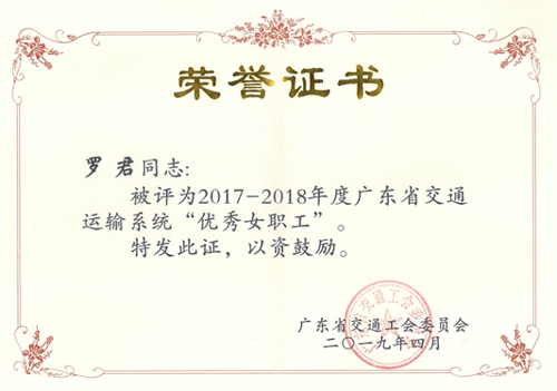 近日,我公司被广东省交通工会评为2017-2018年度广东省交通运输系统“先进女职工集体”;此外,我公司黄湛军总经理获评为2017-2018年度广东省交通运输系统“优秀职工之友”,金为政同志获评为“优秀工会工作者”,罗君同志获评为“优秀女职工”。 特此报喜!