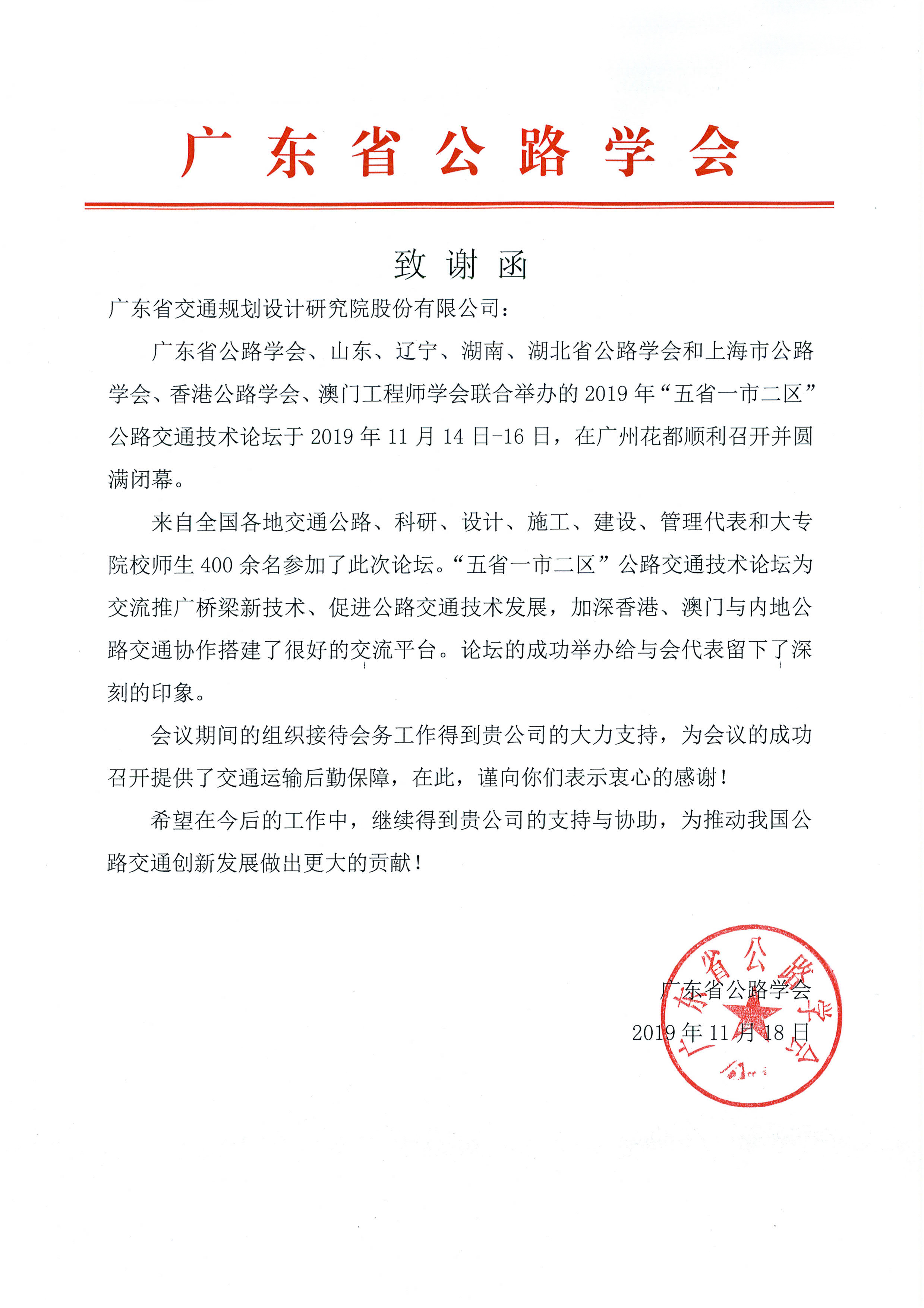 我公司高度重视此次论坛的协办工作,派出会务团队全程跟进、积极配合、倾力服务,为会议的成功召开贡献了一份力量,得到了主办方广东省公路学会的高度肯定。为此,省公路学会特发来致谢函向我公司表示感谢!