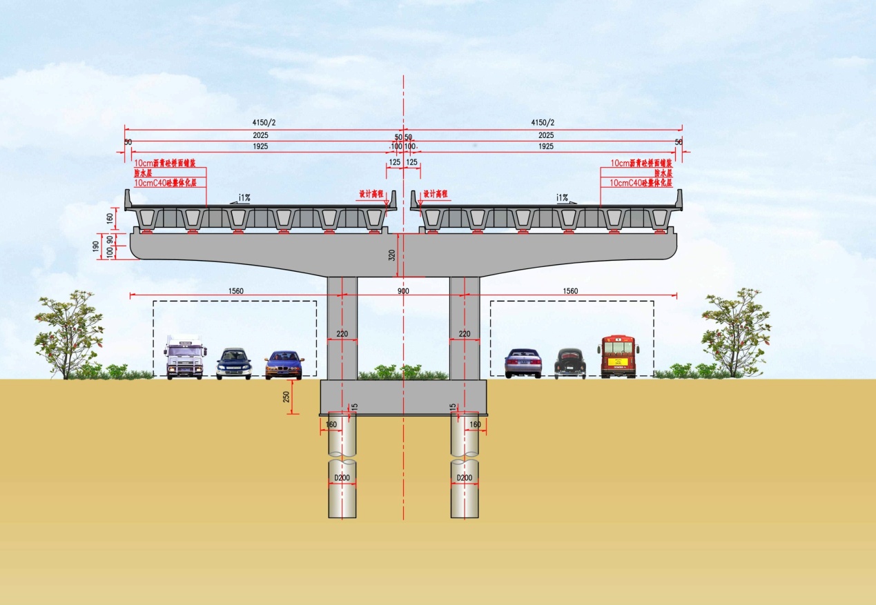 本项目中,桥梁与民古路共线长度达27.25km。民古路利用高速公路桥下空间布设,因而在设计时注重对桥梁的上、下部结构的选用以及桥梁景观等内容的比选。推荐方案桥梁墩柱利用桥下道路中央分隔带集中落墩,采用了整幅大悬臂双柱墩,并以倒“T”截面降低盖梁视觉高度,减少占用桥下空间。