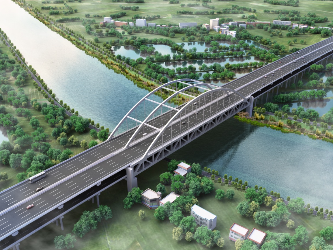 黄沙沥大桥采用了高速公路与民古路合建的双层桥梁,上下层均为双向八车道标准。主桥为192m简支下承式钢桁梁-柔性拱,采用三主拱、三主桁方案,矢跨比为1/5.25;拱轴线采用悬链线,拱轴系数1.5。主桁横向中心间距为2×22.25m,桥梁全宽46m。主桥主桁立面采用带有竖杆的华伦式桁架,桁架节间距12m,桁高10m,高跨比1/19.2