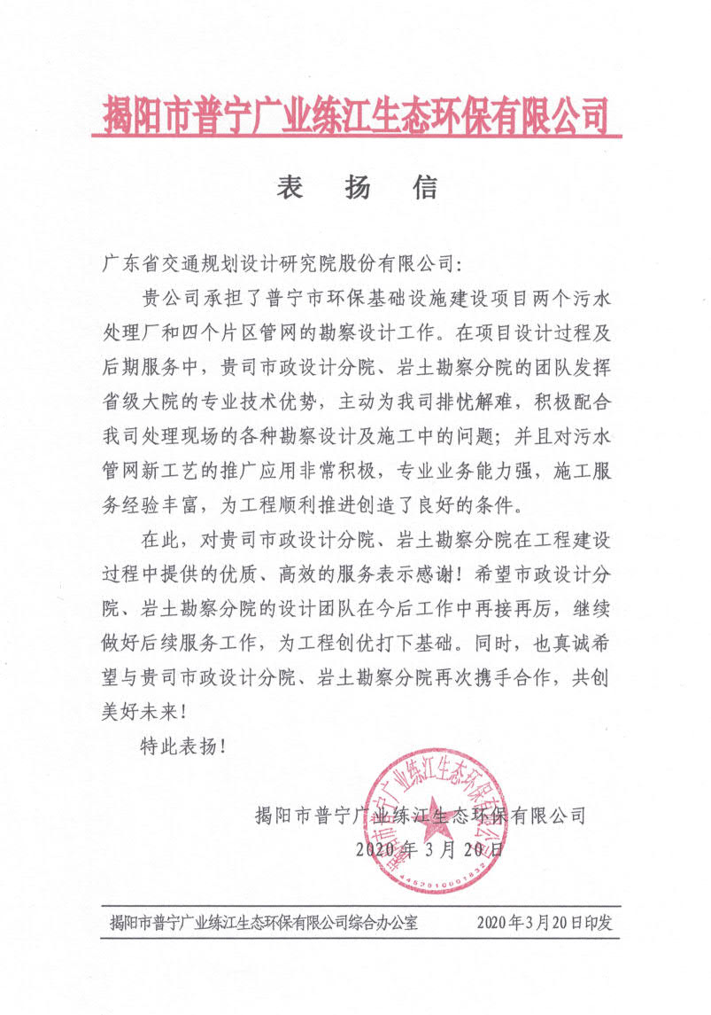 近日,揭阳市普宁广业练江生态环保有限公司发来表扬信,对我公司在普宁市练江环保基础设施建设项目勘察设计和施工后服务工作中,体现的专业技术优势、专业服务能力、丰富的施工服务经验以及积极推广应用新工艺的实际行动表示充分肯定,并对我公司具体负责该项目的市政设计分院和岩土勘察分院团队给予了通报表扬。