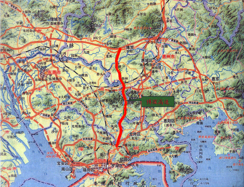 博深高速公路是广东省高速公路网规划“九纵五横两环”中的第四纵线深圳至湖南汝城高速公路的重要组成部分,2008年被列入“新十项工程”。项目跨惠州、东莞、深圳3个城市,全长63.2公里,概算总投资85.94亿元。项目起于惠州市博罗县罗阳镇,止于深圳市龙岗区排榜互通立交,与盐排高速公路相接。全线采用双向六车道高速公路标准设计,设计行车速度为100公里/小时。本项目计划2012年底建成通车。